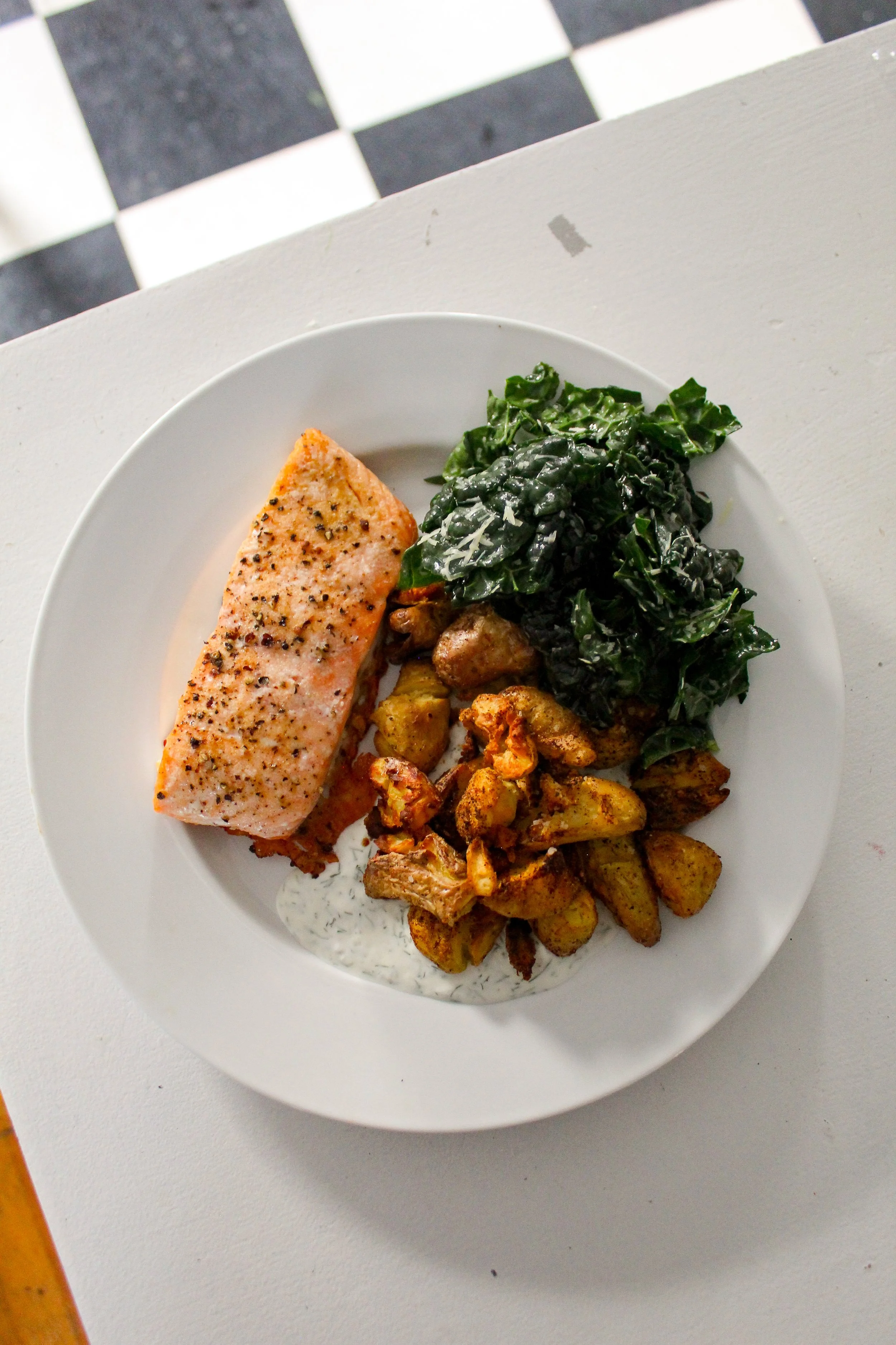 Simple salmon w/ smashed potatoes & dilly yogurt