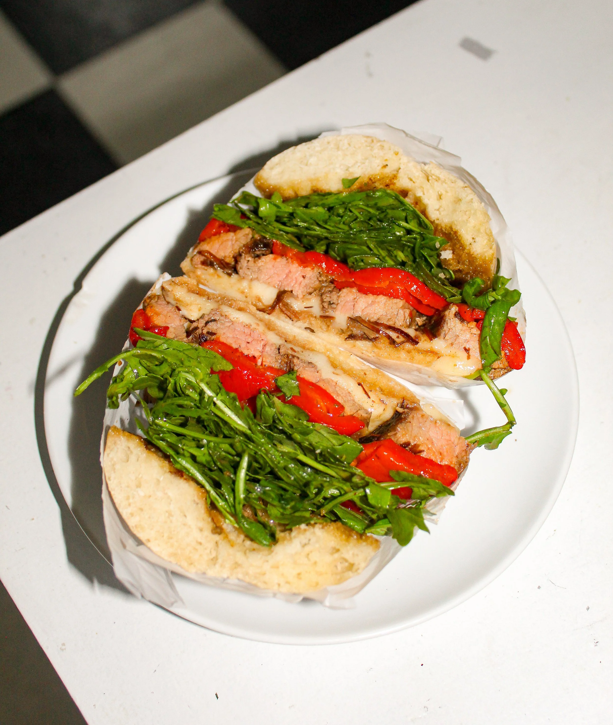 For this steak sandwich I toasted a ciabatta role from Trader Joe’s, rubbing a garlic clove on both sides once toasted. Then I assembled like so: Fresh, low-moisture mozzarella, flank steak, roasted red pepper, fresh basil, and arugula that was dressed with balsamic glaze. I’ve been dreaming about this sandwich ever since I made it—to say it’s my new hyperfixation meal is an understatement.